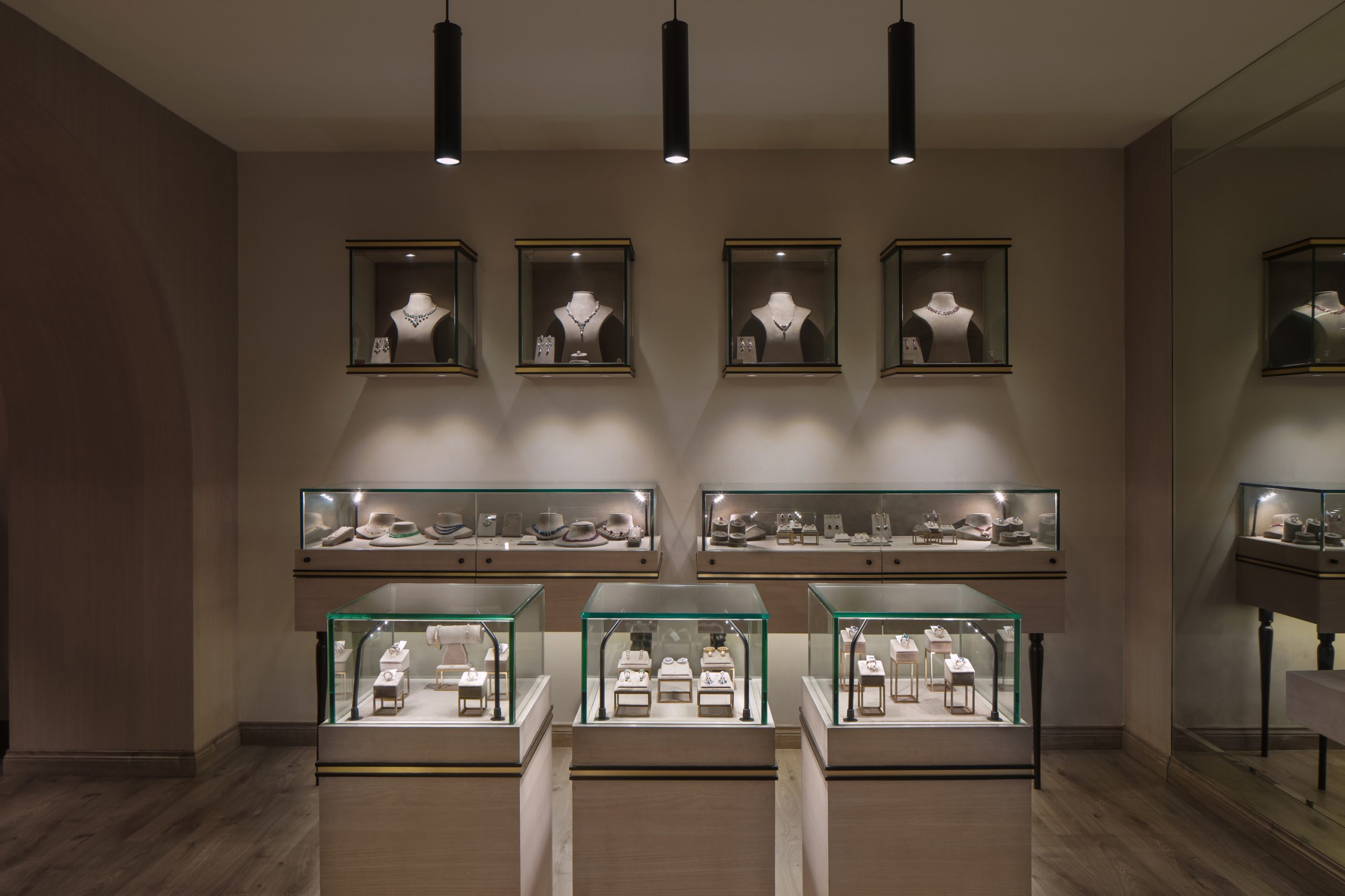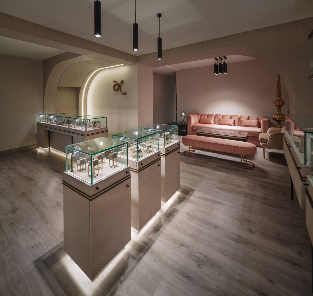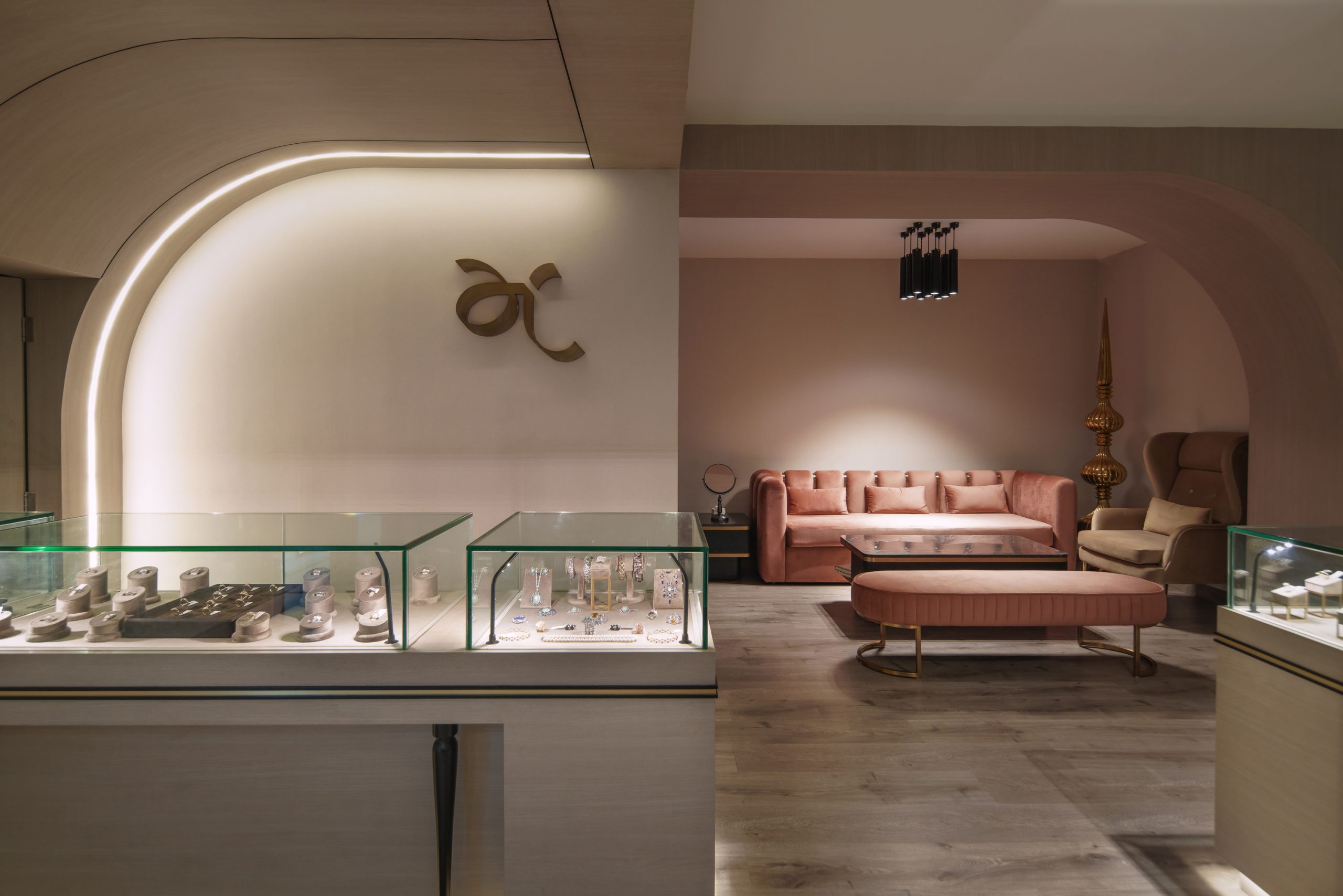 The interiors are a harmonious blend of exhibition-inspired layouts and retail functionality. Clean lines and minimalist displays ensure that the jewelry remains the focal point, while subtle textures and lighting enhance its allure. The space is thoughtfully segmented to guide visitors through a journey, encouraging exploration and discovery at every turn.