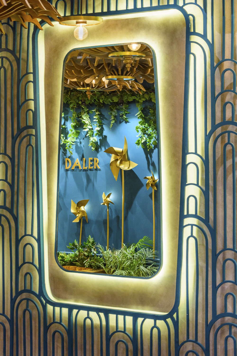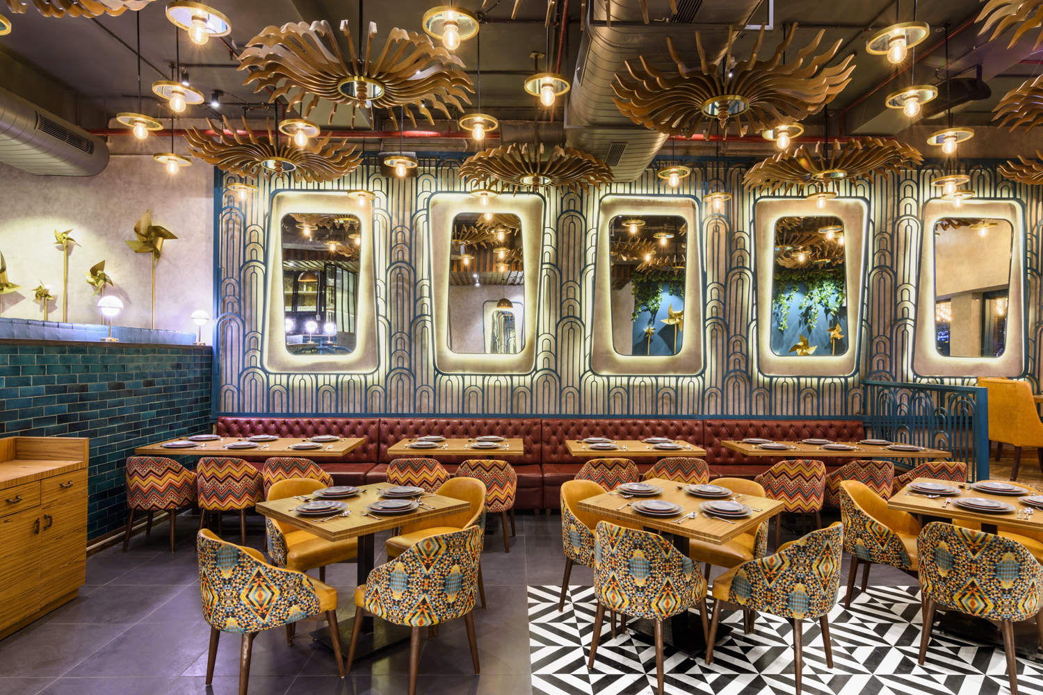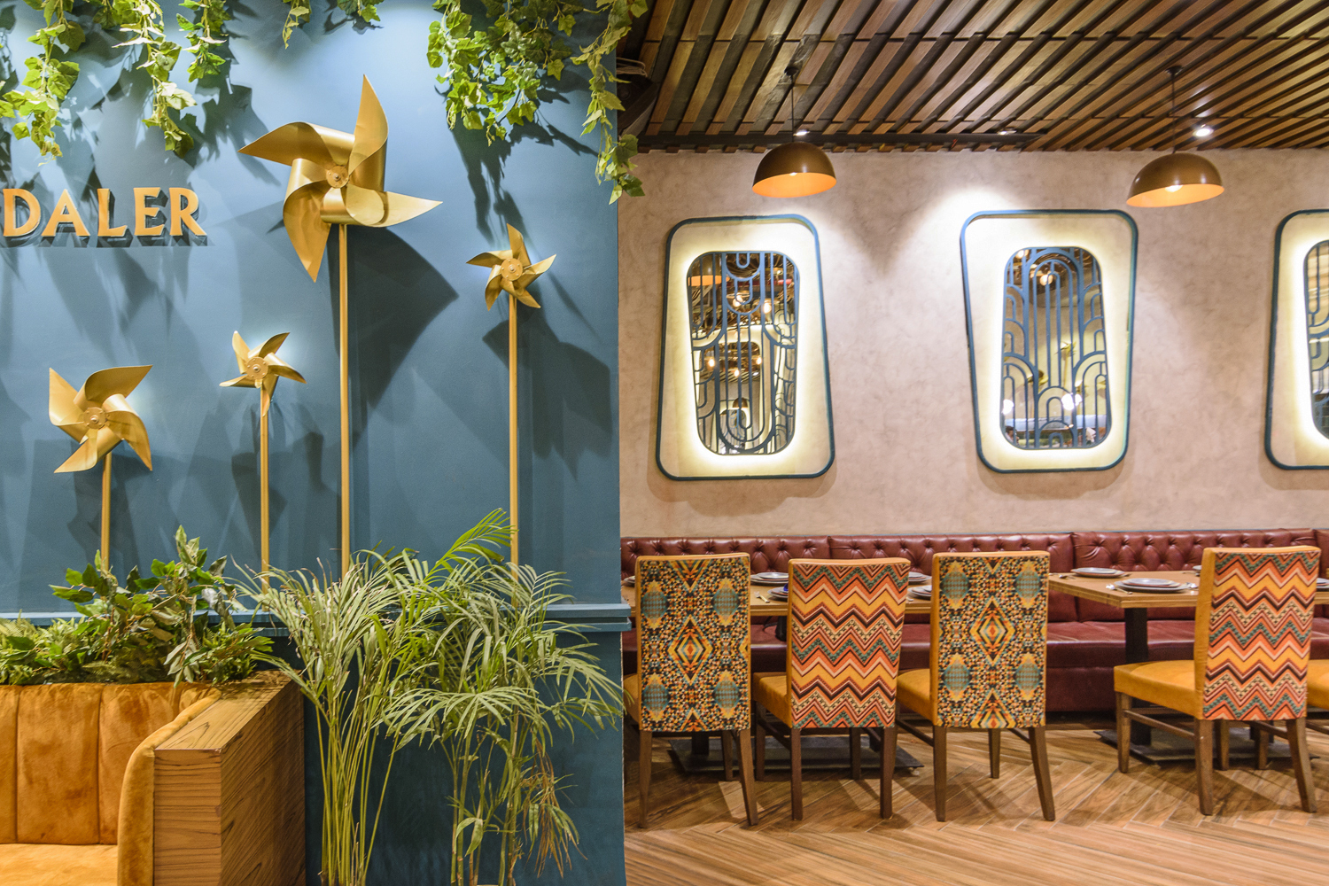 A swirl of colors, textures, and movement greets you at Daler, a space that feels alive with celebration. Golden pinwheels hover overhead, mirrors multiply light and reflections, and every curve, surface, and installation seems to hum with the joy of festivity. The interiors carry the energy of a traditional Indian celebration, yet every element is carefully composed, giving the space a rhythm that is dynamic, yet intimate. There’s an effortless charm here—playful, grand, and warmly inviting all at once.