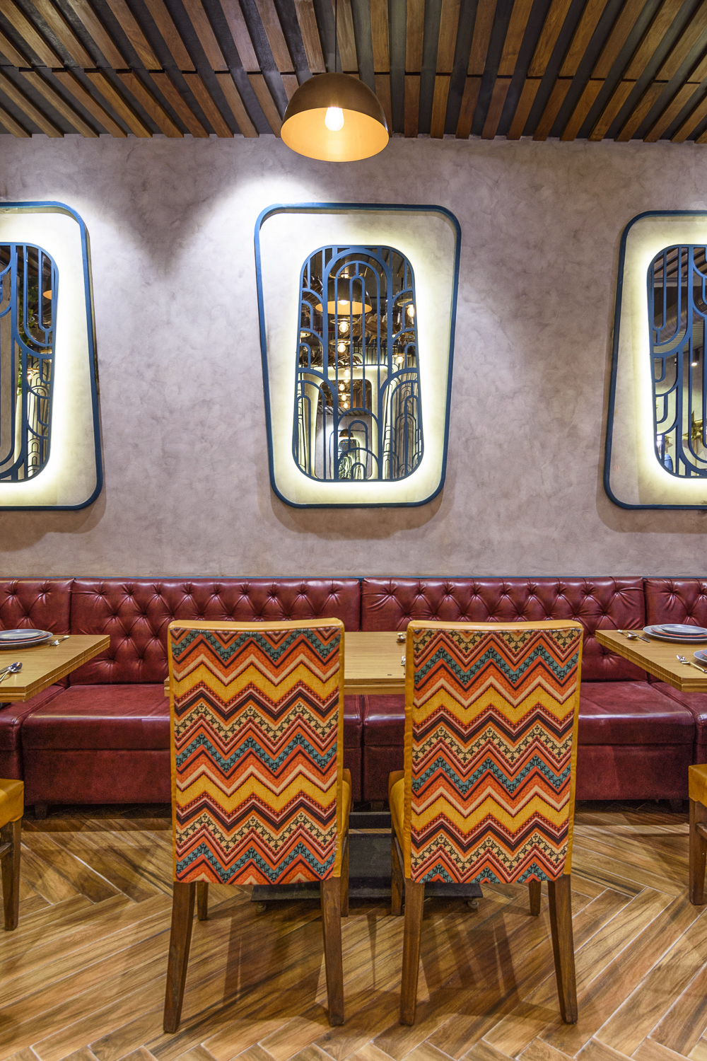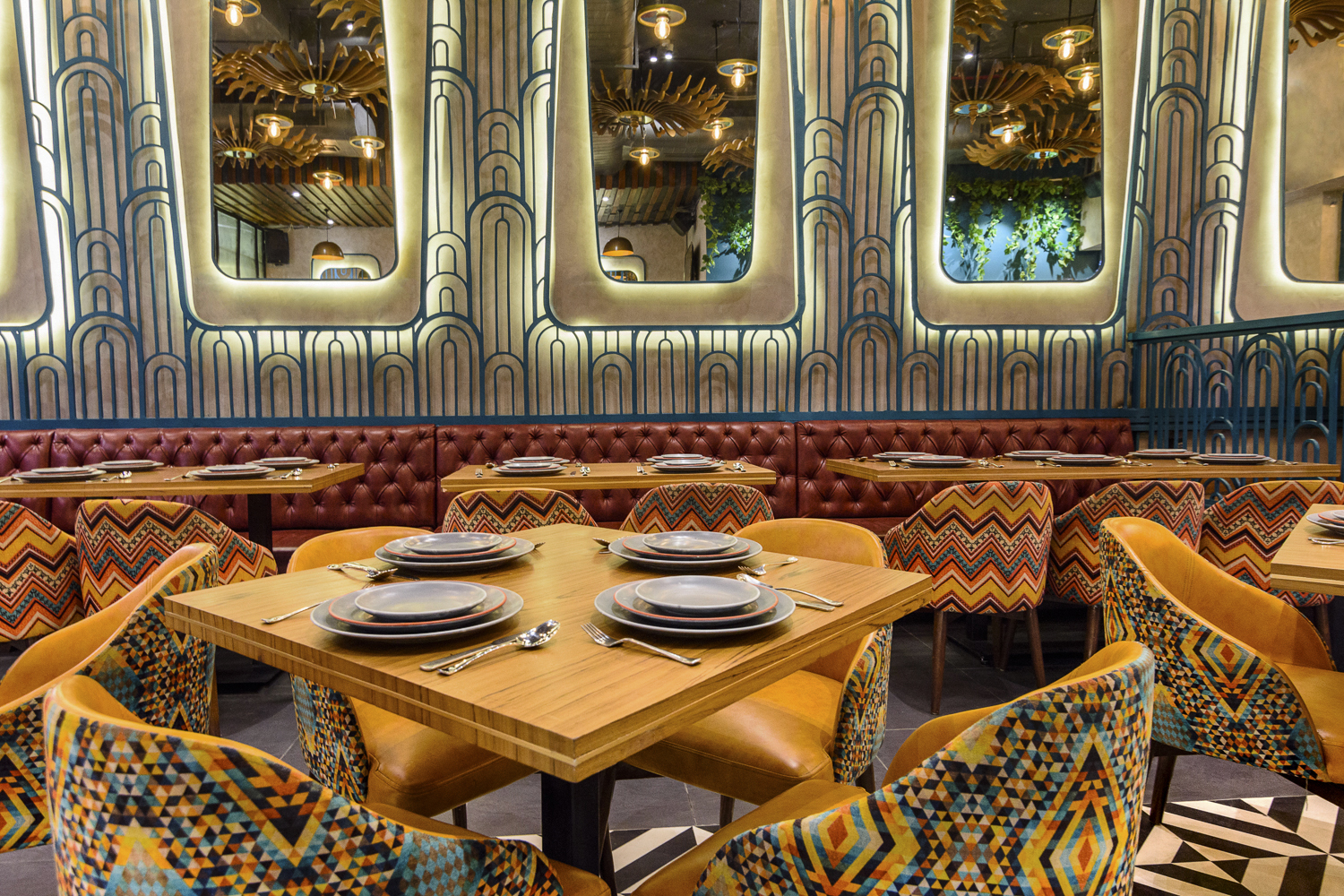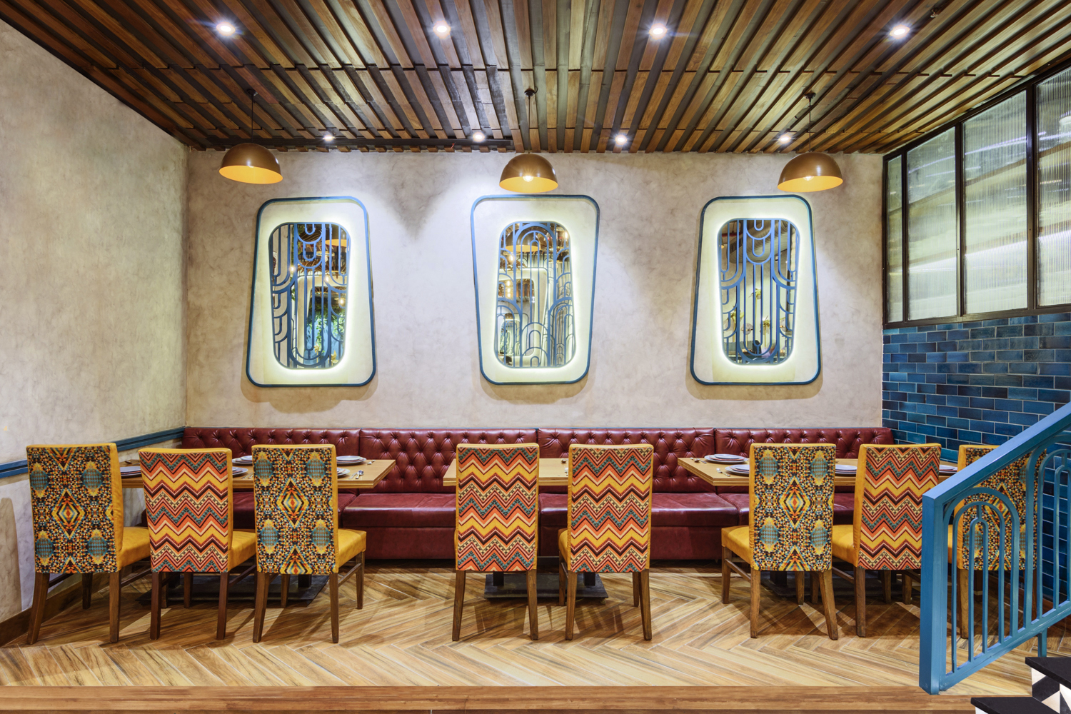 A swirl of colors, textures, and movement greets you at Daler, a space that feels alive with celebration. Golden pinwheels hover overhead, mirrors multiply light and reflections, and every curve, surface, and installation seems to hum with the joy of festivity. The interiors carry the energy of a traditional Indian celebration, yet every element is carefully composed, giving the space a rhythm that is dynamic, yet intimate. There’s an effortless charm here—playful, grand, and warmly inviting all at once.