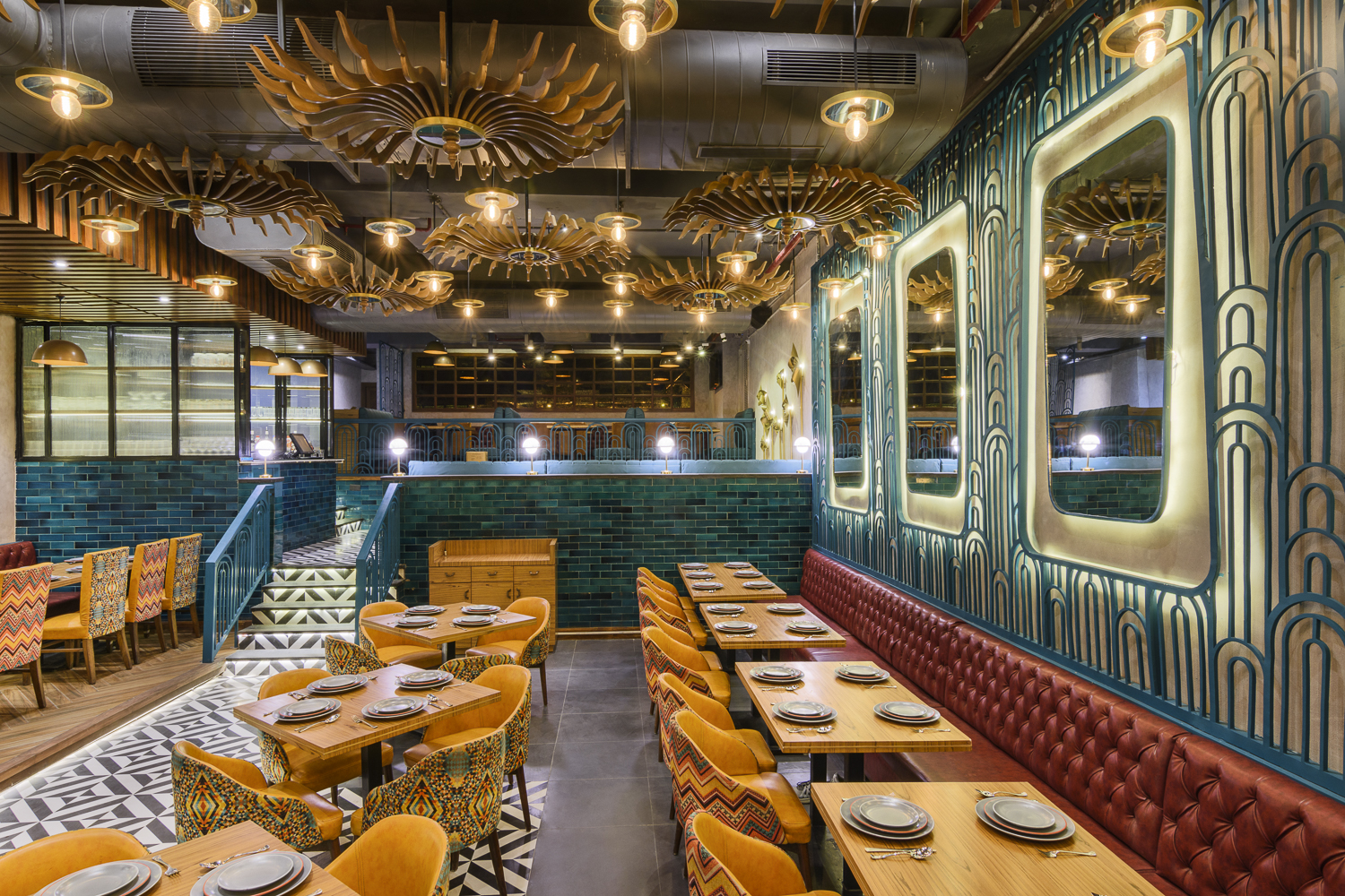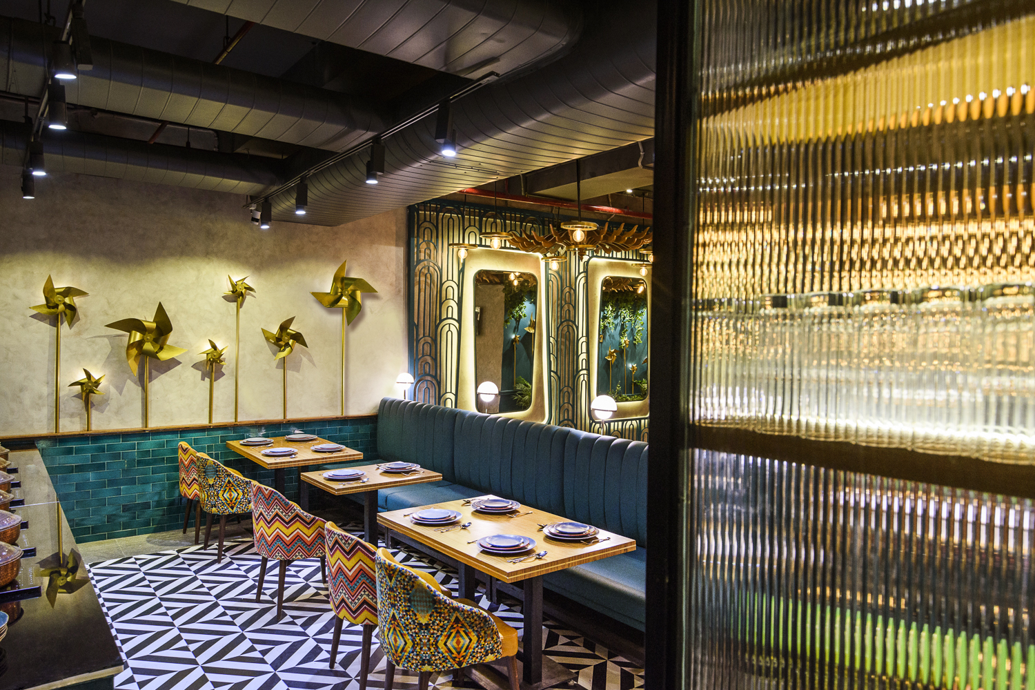 The design palette balances vibrancy with sophistication—grey concrete finishes and teal accents harmonize with black-and-white flooring, fluted glass, and reflective surfaces. A dramatic ceiling installation, reminiscent of a giant wheel, ties the interiors together, evoking the grandeur of traditional Indian festivities. Every fixture, material, and corner is carefully orchestrated to create a cohesive and immersive environment.